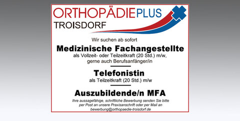 Ab sofort sucht die Gemeinschaftspraxis für Orthopädie und Unfallchirurgie, Orthopädie Plus Troisdorf, in unmittelbarer Nähe des Bahnhofs in der Poststraße, Verstärkung für das Praxisteam: