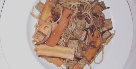 1 Knoblauchzehe20 gr. Ingwer, frisch400 gr. Tofu6 El Sojasauce2 Tl ZuckerrübensirupChili, gemahlenSalz2 rote Zwiebeln6 Karotten500 gr. Spaghetti2 El Öl