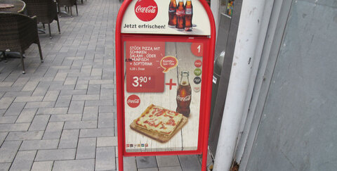 Kauft jetzt ein Stück Pizza mit Schinken, Salami oder Thunfisch und einen Softdrink (0,33l Dose) für nur 3,90 Euro.