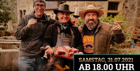 Oliver Sievers, der amtierende BBQ-Weltmeister, Ralf Mechlinski, BBQ-Ikone und Herausgeber des Magazins „Meat In“ und Axel, grillen für Euch outdoor auf dem neuen „EOF-Feuerplattengrill“.