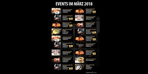 Die ALL YOU CAN EAT-Events "BBQ Night" und "Spare Ribs Night" finden im März regelmäßig an festgelegten Tagen statt. Die "BBQ Night" findet immer Donnerstags statt. Auf die "Spare Ribs Night" könnt ihr euch immer Montags freuen!