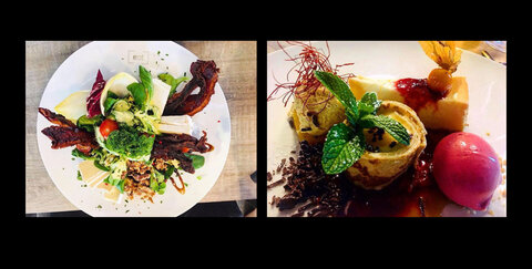 Das zweite Gericht ist eine neue Dessertvariation aus hausgemachtem NY-Cheesecake, Schattenmorelleneis, Mousse von weißer Schokolade und Crêpe mit Pfirischmousse auf einem Erdbeerragout - diese Leckerei passt einfach immer!