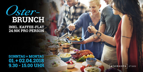 Anmeldung nur telefonisch 02241/8995720, www.elements-of-taste.de unter "Reservierung" WICHTIG: bei Vermerk "OSTERBRUNCH" eintragen, damit wir wissen, dass es für diesen Event ist oder per E-Mail unter reservierung@elements-of-taste.de