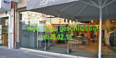 Die Esprit Filiale erneuert das Ladenkonzept und hat daher ab Montag, den 26.02.2018 geschlossen - wir informieren euch, wann die Neueröffnung startet!
