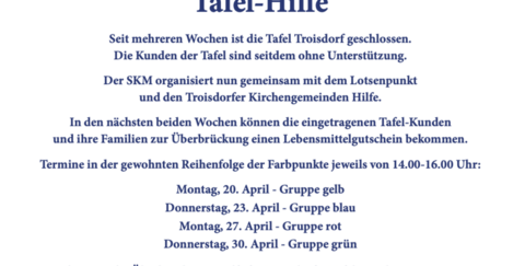 Die Menschen in Troisdorf, die normalerweise mit Lebensmitteln von der Tafel versorgt werden, stehen in diesen Wochen wegen der Schließung ganz ohne Unterstützung da. Zur Überbrückung leisten die evangelischen und katholischen Kirchengemeinden mit dem SKM und dem Lotsenpunkt Hilfe. In der zweiten Monatshälfte des April werden Lebensmittelgutscheine an die Tafel-Kunden ausgegeben. Wir rechnen insgesamt mit ca. 750-800 Bedarfspersonen, für die wir Gutscheine ausstellen. Die Unterstützung der Aktion durch Spenden ist deshalb herzlich willkommen.