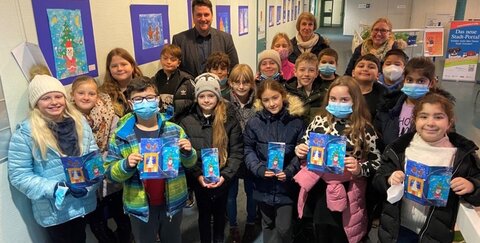 Ein Weihnachtsmann, dem die Brille von der Nase rutscht, schmückt in diesem Jahr die Weihnachtskarte des Troisdorfer Bürgermeisters. Gemalt hat sie Leo. Er besucht die vierte Klasse der Evangelischen Grundschule Troisdorf und beteiligte sich mit seinen Mitschülerinnen und Mitschülern am diesjährigen Malwettbewerb des Bürgermeisters für die Weihnachtskarte. Bei einem Besuch mit seiner Klasse im Rathaus durfte Leo als 1. Preis ein Eintrittskarte des Erlebnisbads Aggua in Empfang nehmen ebenso wie die Zweit- und Drittplatzierten Fiona und Daniel.