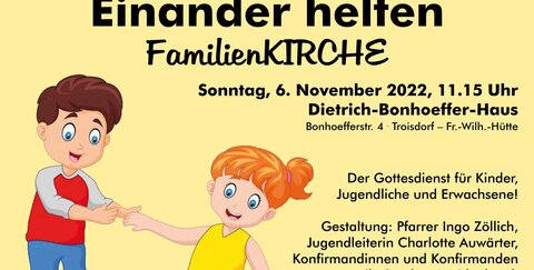 Der Gottesdienst spricht alle Altersgruppen an - Kinder, Jugendliche und Erwachsene - und findet im Dietrich-Bonhoeffer-Haus, am 6.11.22, um 11:15 Uhr statt.
