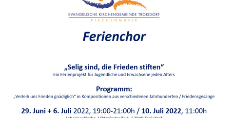 Sängerinnen und Sänger, die auch in den Ferien singen möchten, können sich zu einem Ferienchor-Projekt der Evangelischen Kirchengemeinde Troisdorf anmelden. Das Projekt unter der Leitung von Kirchenmusikdirektorin Brigitte Rauscher hat den Titel "Selig sind, die Frieden stiften". Es ist das Leitmotiv der diesjährigen Sommerpredigtreihe. Der Ferienchor studiert Sätze zur Friedensthematik aus verschiedenen Epochen ein und singt sie im Gottesdienst.