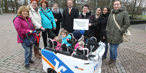 Neun „Kinderbusse“ verschenkte die VR-Bank Rhein-Sieg kurz vor Weihnachten an neun KiTas aus Ihrem Geschäftsgebiet. Zur Übergabe der Groß-Kinderwagen waren nicht nur die Repräsentanten der Einrichtungen und Fördervereine im Innenhof der Burg Wissem in Troisdorf erschienen, sondern auch zahlreiche Eltern und Kinder.