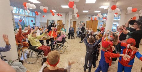 Danach verliehen sie den Kita-Orden in den fünf Gruppen unserer Einrichtung. Kaum war die Aufgabe erledigt, stand schon der nächste Termin an. Im Haus Curanum wurde das Dreigestirn schon erwartet. Gemeinsam mit einem Gefolge aus zukünftigen Schulkindern haben sie die Seniorinnen und Senioren besucht, um Strüßjer zu verteilen und die Kita-Orden zu verleihen. Natürlich haben sie auch an die Bewohner*innen auf den Stationen gedacht und ihnen die Blumen und Orden auf ihre Zimmer gebracht. Im Anschluss wurde noch gemeinsam gesungen und getanzt.