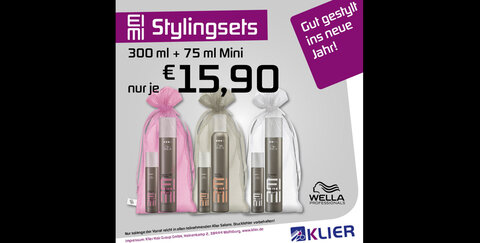 Bei Klier gibt es jetzt drei verschiedene Stylingsets von Wella-Professionals. In jedem Set sind eine 300 ml Flasche mit einem "Emmi"-Stylingprodukt und eine passende Mini-Version (75 ml).