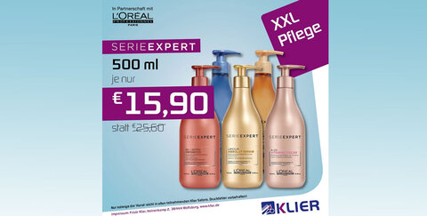 Sichert Euch jetzt eure XXL Pflege bei Frisör Klier in der Galerie Troisdorf - nur für kurze Zeit erhaltet ihr verschiedene XXL Pflege Shampoo's (500ml) von L'Oréal Professionnel für nur 15,90€ statt 25,60€.