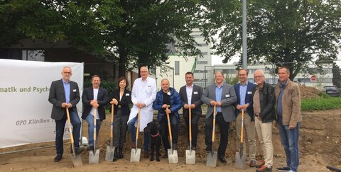 Heute erfolgte der offizielle erste Spatenstich für den Neubau des Fachbereichs Psychiatrie, Psychosomatik und Psychotherapie an den GFO Kliniken Troisdorf – Betriebsstätte St. Johannes. Wie bereits im Juni 2019 angekündigt, wird auf dem Klinikgelände ein neuer Gebäudekomplex mit initial 40 stationären Betten (inklusive einer psychiatrischen Intensivstation) und 20 tagesklinischen Plätzen benötigt, um eine vollumfängliche und wohnortnahe Versorgung psychiatrisch erkrankter Menschen im rechtsrheinischen Rhein-Sieg-Kreis zu schaffen, wie es die Krankenhausplanung des Landes für Troisdorf vorsieht. Bereits seit November 2020 werden 16 psychosomatische bzw. psychiatrische Patienten und ergänzend auch 20 tagesklinische Patienten im bestehenden Klinikgebäude versorgt. Die Klinikleitung rechnet mit einer Fertigstellung des Neubaus im ersten Quartal 2024. Da der Bau während des laufenden Klinikbetriebes stattfindet, wird besonders darauf geachtet, Patienten und Anlieger so weit wie möglich vor Bau- und Verkehrslärm zu schützen. Finanziert wird das Projekt aus Baupauschalen des Landes und Eigenmitteln der GFO als Träger der GFO Kliniken Troisdorf.