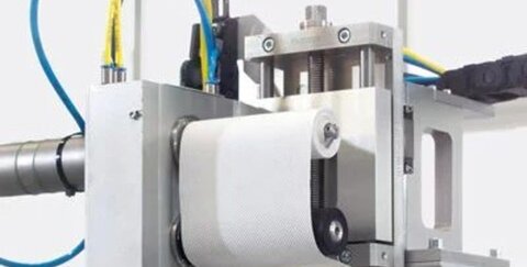 Kernstück unseres flexiblen Systems ist ein multifunktionales Reinigungsmodul, das auf einer Schiene, beispielsweise an einer Glättwalze, horizontal vorbeigeführt wird. Dabei drückt ein Polster ein spezielles Reinigungstuch auf die Walze, die so spiralförmig gereinigt wird. Der seitliche Vortrieb des Moduls passt sich dabei automatisch an die Rotationsgeschwindigkeit der Walze an. Auch die Reinigung von besonders verschmutzten Stellen – beispielsweise an den Rändern – ist durch die frei wählbare Positionierung des Reinigungsmoduls problemlos möglich.