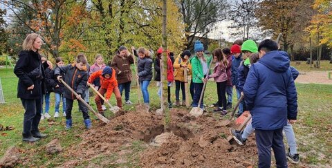 Bildbeschreibung: Kinder der „Grünbär-Klasse“ der Oberlarer Janosch-Grundschule pflanzen einen Kastanienbaum