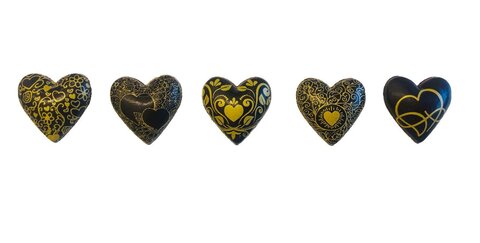 Ein echter Hingucker ist das goldene, florale Muster auf allen fünf Herzen, die aus feinster belgischer Schokolade sind.