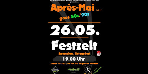 Auch in diesem Jahr veranstaltet der Junggesellenverein "Eintracht" Kriegsdorf 1862 wieder seine legendäre „Après-Mai Fete“ im größten Maifestzelt der Region. In diesem Jahr das erste Mal unter dem Motto „Après-Mai goes 80s/90s“.