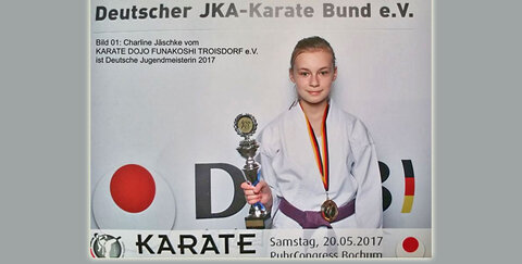 Das KARATE DOJO FUNAKOSHI TROISDORF e.V. stellt mit Charline Jäschke, auf den diesjährigen Deutschen Karate-Meisterschaften des Deutschen JKA-Karate Bund e.V. (DJKB) am 20.05.2017 in Bochum, eine Deutsche Jugendmeisterin in der Disziplin Kata (Form). Ein starker Rene Pape kämpft sich bis in das Kumite-Halbfinale (Kampf) vor und rundet damit den Erfolg der Karateka vom KARATE DOJO FUNAKOSHI TROISDORF e.V. ab.