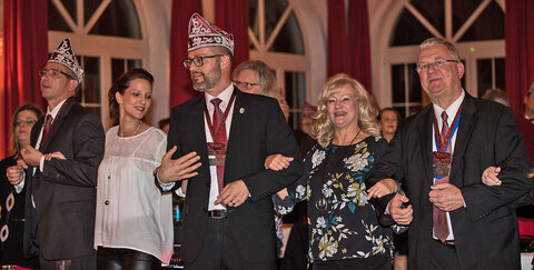 Nach einem sehr leckeren Abendessen konnten wir das designierte Prinzenpaar der Stadt Troisdorf Heinz-Peter I. und Gerda II. (Holländer) mit Ihrem Adjutanten Dietmar und Hofdame Mechthild (Bläser), sowie dem Prinzen- und Gefolgeführer Robert Gall begrüßen. Im ersten musikalischen Teil brachten Sakkokolonia den Saal zum Mitsingen. Die alten Kölschen Krätzcher, dargebracht mit Quetsch und Flitsch, waren eine gelungene Abwechslung. Anschliessend wurde unser neuer Sessionsorden präsentiert. Die ersten Träger des neuen Ordens waren unsere Ehrenmitglieder Peter Bernau, Rolf (Kicki) Kielbassa und Walter Gerecke. Ebenso erhielten die Ehrensenatoren und Mitglieder den neuen Orden, der von Sabrina und Thomas Blatzheim entworfen wurde.