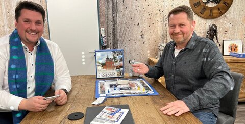 Bürgermeister Alexander Biber hat zusammen mit Dietmar Krüger von der Firma KS Containrerdienst, einem von zwanzig Troisdorfer Unternehmen, die die Herausgabe des Spiels gefördert haben, das Spiel ausprobiert und konnte sich vom Spielspaß überzeugen.