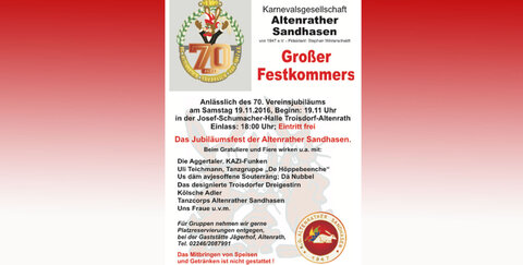 Beim Jubiläumsfest der Altenrather Sandhasen wirken unter anderem mit: Die Aggertaler, die Kazi-Funken, Uli Teichmann, die Tanzgruppe "De Höppebeenche", Us däm avjesoffene Souterräng, Dä Nubbel, das designierte Troisdorfer Dreigestirn, Kölsche Adler, Tanzcorps Altenrather Sandhasen, "Uns Fraue", u.v.m.