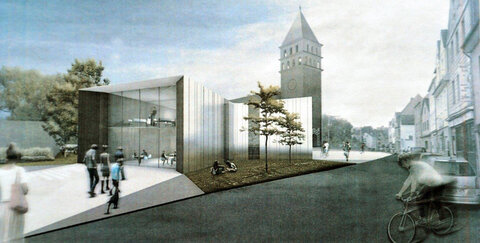 Als Stadteingang zur Fußgängerzone Hippolytusstraße ist das neue Pfarrzentrum gedacht, das an der katholische Kirche St. Hippolytus entsteht.