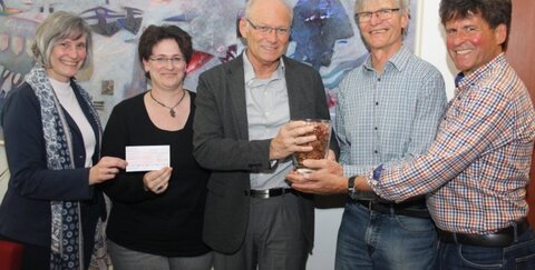 Die Übergabe der Spende fand im Büro des Ersten Beigeordneten Heinz Eschbach statt, der den Scheck und das Geld-Glas zusammen mit der Personalratsvorsitzenden Maria Quabeck und Marion Oestermann, Abteilungsleiterin des Personalmanagements, überreichte.