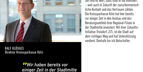 Innenstädte sind Orte gelebter Nachbarschaft und gewachsener Strukturen. Sie sind es wert, dass man in sie investiert – weil auch in Zukunft der zwischenmenschliche Kontakt und das Vertrauen zählen. Die Kreissparkasse Köln hat hier bereits vor einiger Zeit in den Ausbau und das Beratungsumfeld ihrer Regional-Filiale in der Stadtmitte investiert. Mit ihrer Zukunfts-Initiative Troisdorf, ZiTi, ist die Stadt auf dem richtigen Weg und hat Unterstützung verdient. Deshalb bin ich Botschafter.