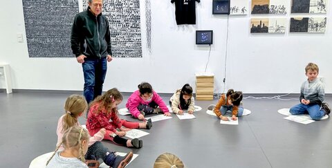 Durch die aktuelle Ausstellung SCHWARZ WEISS führten Masoud Sadedin und Frank Baquet. Im Anschluss an die Führung konnten die Kinder selbst zu Papier, Kohle, Kreide und Buntstiften greifen.