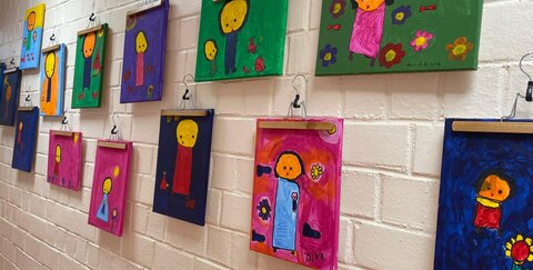 Die Bilder der Kinder sind so schön geworden, dass eine Kunstausstellung im Kindergarten eröffnet wurde.