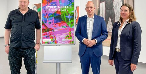 Vorstellung des EXPERIMENTALE Festivalprogramms mit Frank Baquet, Raphael Drache KSK und Kulturdezernentin Tanja Gaspers (v.l.n.r.) im Kunsthaus Troisdorf. Die EXPERIMENTALE startet am 23.9.21 um 19:30 Uhr im Kunsthaus Troisdorf.
