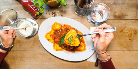 Cuori Innamorati: Herzförmige Pasta mit Ricotta-Füllung mit Auberginen und Kirschtomaten in leichter Tomatensauce.