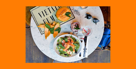 • Netzmelone mit grünem Blattsalat, Oliven mit Stein, Flusskrebsen und Minze mit pikantem Orangen-Ingwer-Dressing