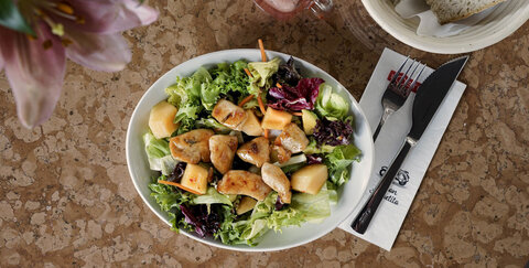 • Insalata Pollo e Avocado: Gemischter Salat mit gebratenen Hähnchenbruststreifen, Avocado und Netzmelone an pikantem Orangen-Ingwer-Dressing