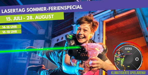 Während der Sommerferien (15. Juli - 28. Aug.) gibt es bei täglich (Mo.-Fr.) von 14-16 Uhr sowie von 16-18 Uhr ein unschlagbares Angebot - 6 Lasertag Spiele für nur 19,90 Euro, mit Membercard nur 17,90 Euro.