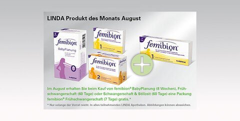 Im August erhalten Sie beim Kauf von femibion®BabyPlanung (8 Wochen), Frühschwangerschaft (60 Tage) oder Schwangerschaft & Stillzeit (60 Tage) eine Packung femibion® Frühschwangerschaft (7 Tage) gratis.*