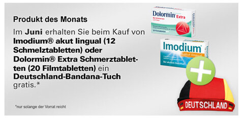 Im Juni erhaltet Ihr beim Kauf von Imodium® akut lingual (12 Schmerztabletten) oder Dolormin® Extra Schmerztabletten (20 Filmtabletten) ein Deutschladn-Bamdama-Tuch gratis