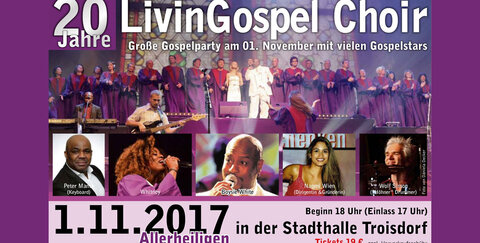 Am 1.11.2017 gastiert der LivinGospel Choir zu seinem 20 jährigen Jubiläum zusammen mit Stars aus der Gospelszene in der neuen Stadthalle in Troisdorf.