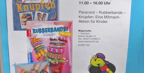 Am Samstag, den 23. Mai 2015 können Kinder in der Zeit von 11:00 bis 16:00 Uhr neue Techniken beim Knüpfen in der Mayerschen Buchhandlung kennen lernen!