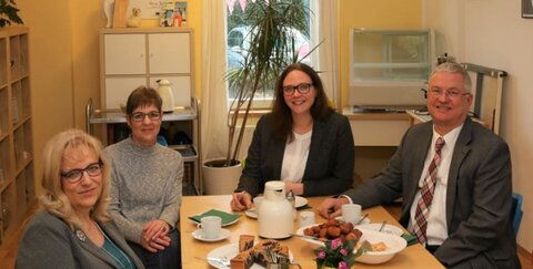 Die Troisdorfer Landtagsabgeordnete Katharina Gebauer und der Troisdorfer Bürgermeister Klaus-Werner Jablonski freuen sich mit dem Team des Mehrgenerationenhauses Troisdorf. Für das Mehrgenerationenhaus sind in diesem Jahr von Seiten des Landes 10.000 Euro mehr vorgesehen.