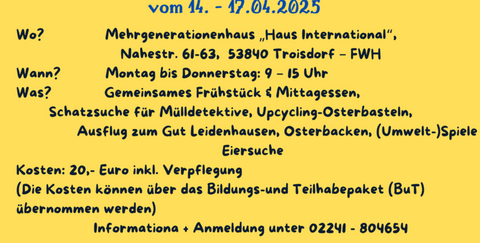 Vom 14. bis 17. April 2025 erwartet die Kinder täglich vom 9.00 bis 15.00 Uhr ein abwechslungsreiches Angebot rund um das Thema Umwelt und Nachhaltigkeit. Auf dem Programm stehen kreative und spielerische Aktivitäten wie eine Schatzsuche für „Mülldetektive“, Upcycling-Osterbasteln, ein Ausflug zum Gut Leidenhausen, Osterbacken und (Umwelt-)Spiele. Natürlich darf auch die traditionelle Eiersuche nicht fehlen.