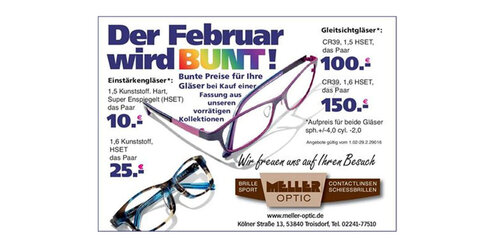 Optic Meller startet in die Februar-Aktion: Mit Wahnsinnspreisen für alle vorrätigen Fassungen inkl. Gläsern.
