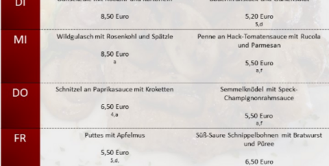 - Menü 1: Wildgulasch mit Rosenkohl und Spätzle für 8,50 Euro.
