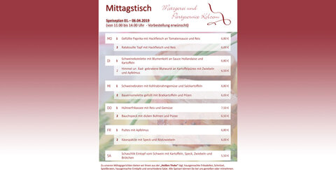 Speiseplan 01. - 06.04.2019 (von 11.00 bis 14.00 Uhr) - Vorbestellung erwünscht