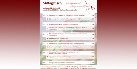 Speiseplan 01. - 06.07.2019 (von 11.00 bis 14.00 Uhr) - Vorbestellung erwünscht