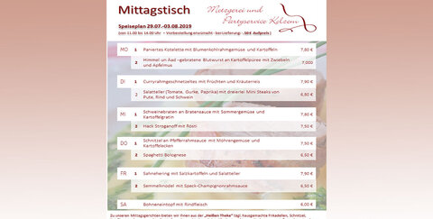 Speiseplan 29.07. - 03.08.2019 (von 11.00 bis 14.00 Uhr) - Vorbestellung erwünscht