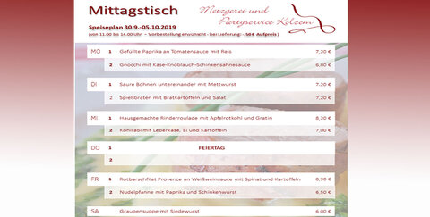Speiseplan 30.09. - 05.10.2019 (von 11.00 bis 14.00 Uhr) - Vorbestellung erwünscht