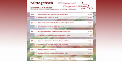 Speiseplan 21.10.2019-26.10.2019 (von 11:00 Uhr bis 14:00 Uhr) - Vorbestellung erwünscht