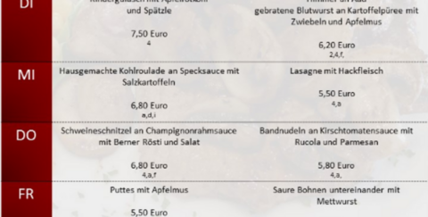 - Menü 1: Rindergulasch mit Apfelrotkohl und Spätzle für 7,50 Euro.
