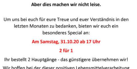 Am Samstag, den 31.10.2020 ab 17:00 Uhr (2 für 1) Ihr bestellt zwei Hauptgänge und das günstigere übernehmen wir!